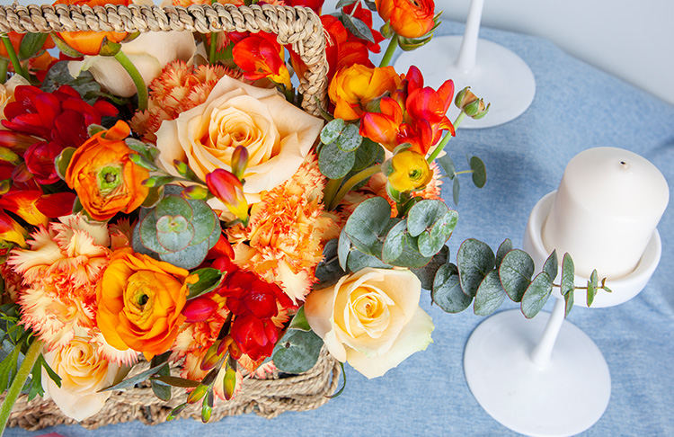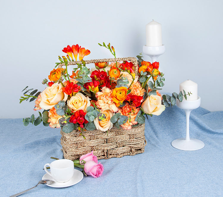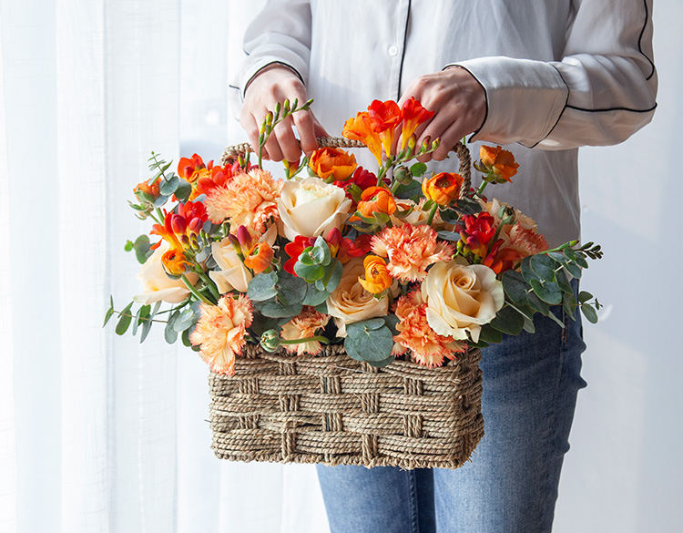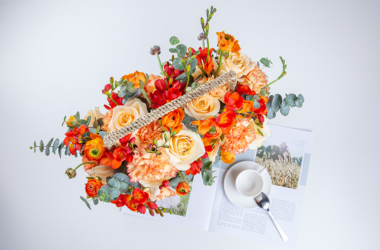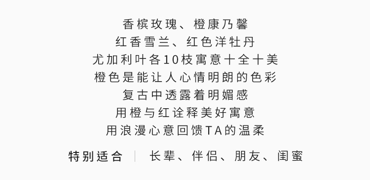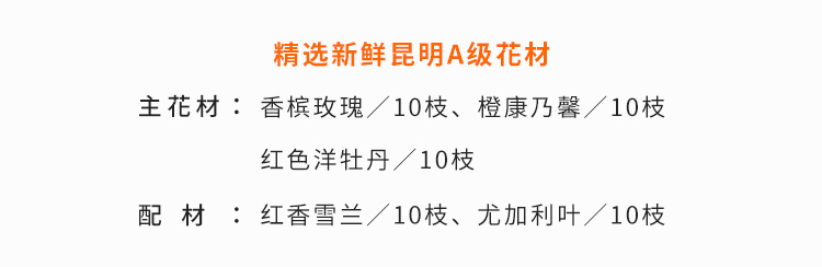 香槟玫瑰10枝,橙康乃馨10枝,红香雪兰10枝,橙色洋牡丹10枝,尤加利叶10枝