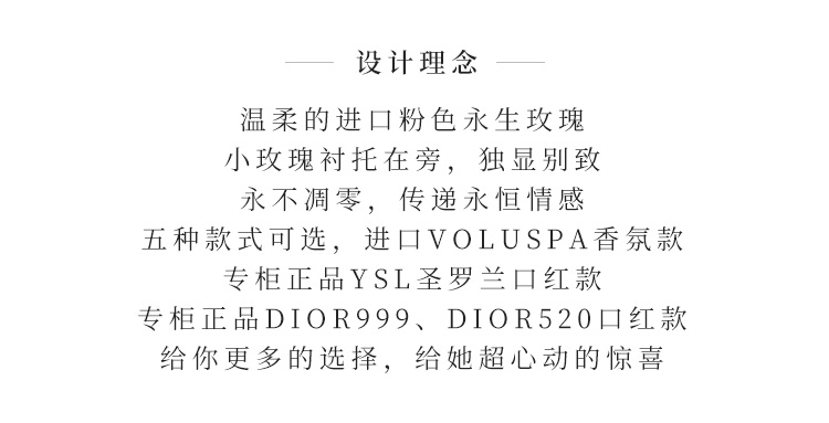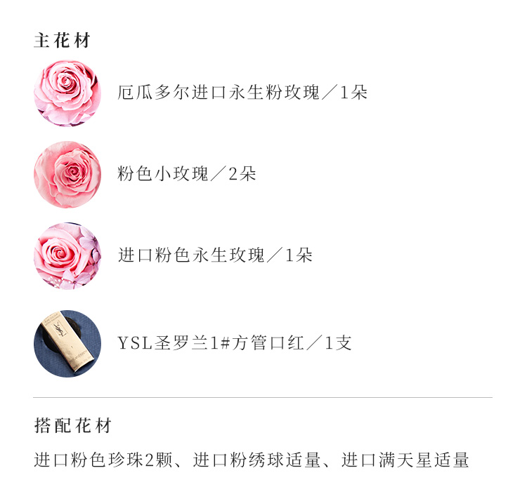 立减8元厄瓜多尔进口永生粉玫1朵(直径6-7CM)、粉色小玫瑰2朵、进口粉色永生玫瑰1朵、进口粉色珍珠2颗、进口粉绣球适量、进口满天星适量;搭配专柜正品YSL圣罗兰方管口红(色号1#)。高档蓝色定制多功能礼盒(永生花盒+升级款带化妆镜+带首饰盒功能)。